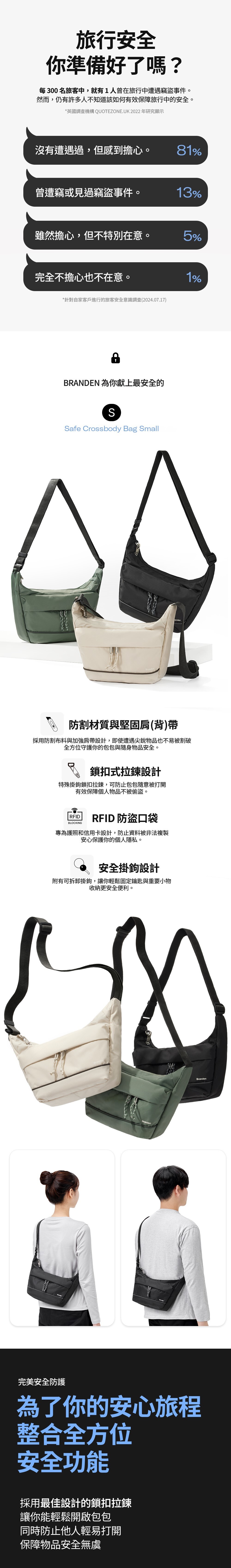 韓國品牌Branden推出防盜旅行斜揹袋Safe Cross Body Bag,內層備有多個內格,輕鬆擺放旅行時所需的各種小物件。外層採用210D防撕裂尼龍,內層則使用UHMWPE特殊防割織物,防割力大大提升,配合RCID Blocking ,絕對是2025最好用的防盜斜揹袋