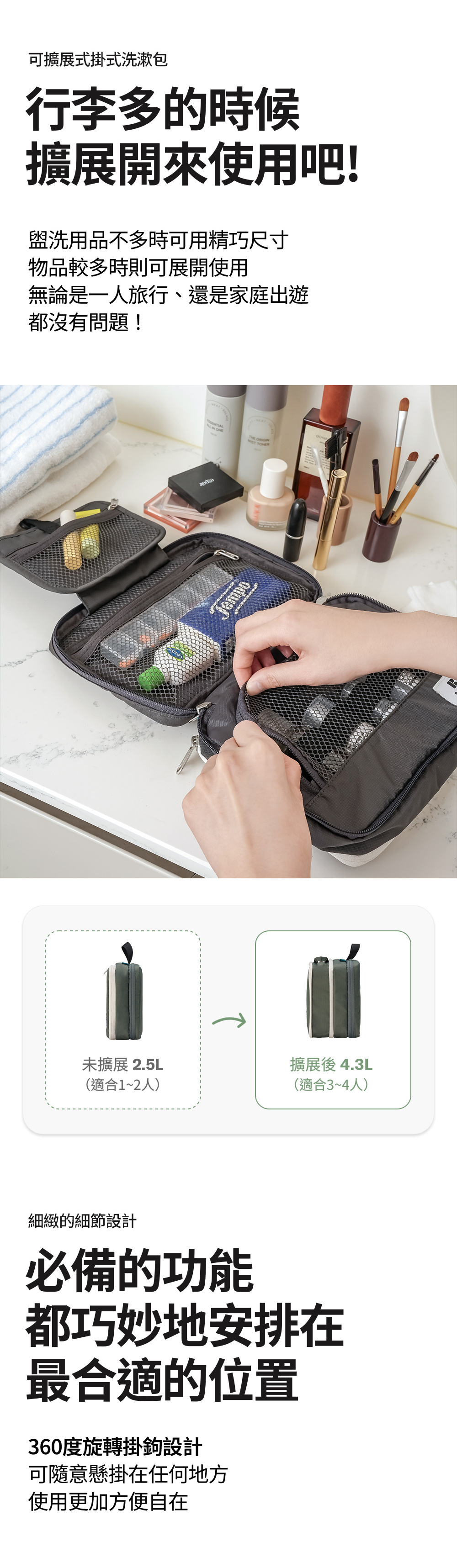 韓國品牌Branden推出可擴展旅行收納袋Wash Bag,三段式折疊設計,可從2.3L擴展至4.3L,滿足1-4人旅行收納所需,防水設計,掛在浴室也不用擔心被淋濕。採用易清潔物料,收放化妝品或沐浴用品後,也能輕鬆清洗。